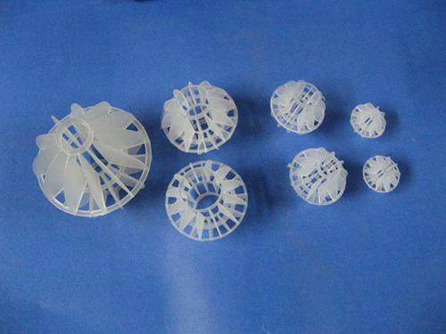 采用聚丙烯塑料制成球狀,在球中部沿整個(gè)周長(cháng)有一道加固環(huán),環(huán)的上下各有十二片球瓣,沿中心軸呈放射形布置,適用于二氯化碳脫氣塔,接觸反應塔等裝置。